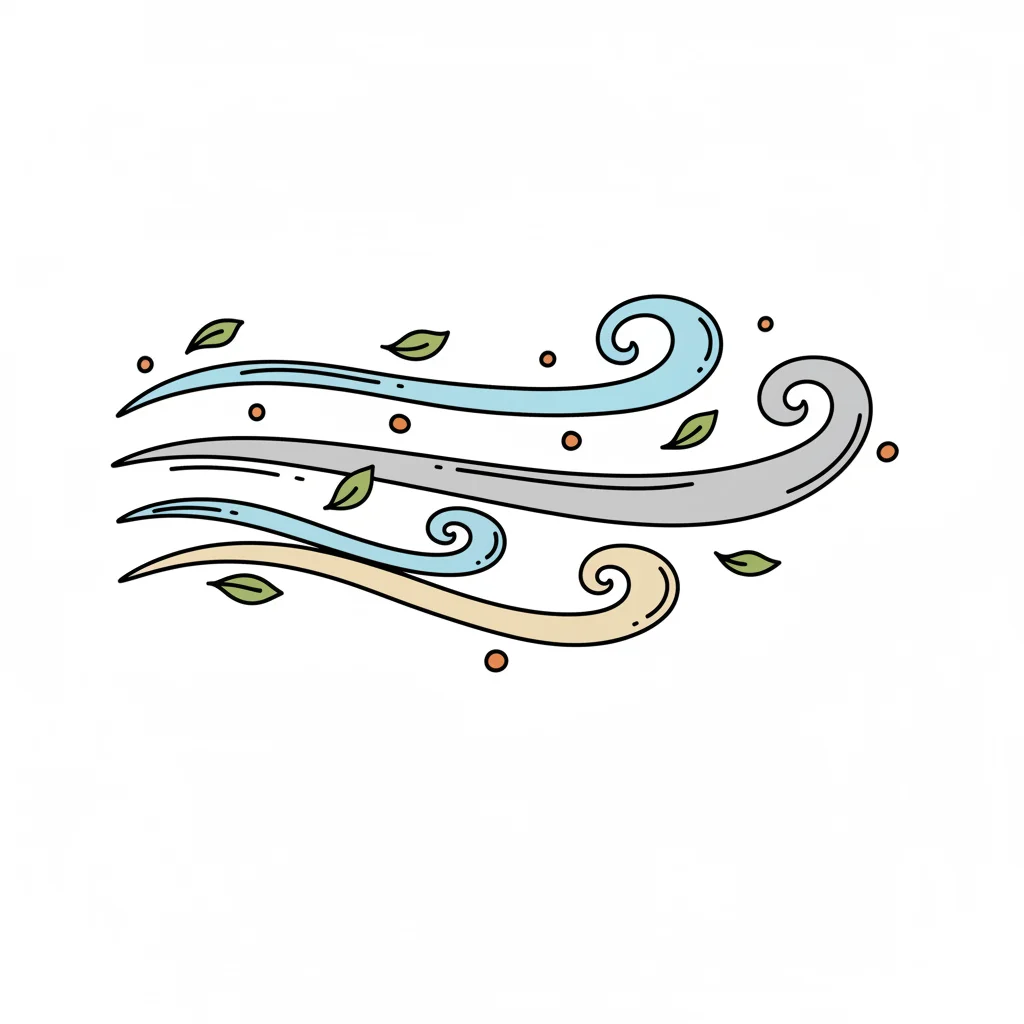 Bunte Wellen mit Blättern, die Bewegung und Natur symbolisieren.