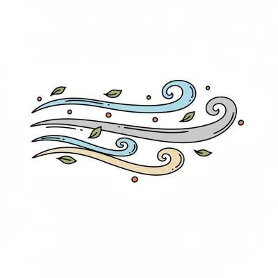 Eine Person bläst Luft aus, begleitet von Blättern und Sonne.