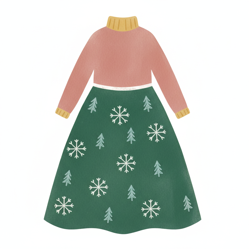 Ein festliches Kleid mit winterlichen Motiven wie Schnee und Tannenbäumen.
