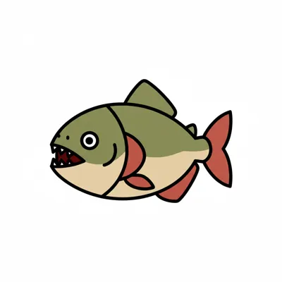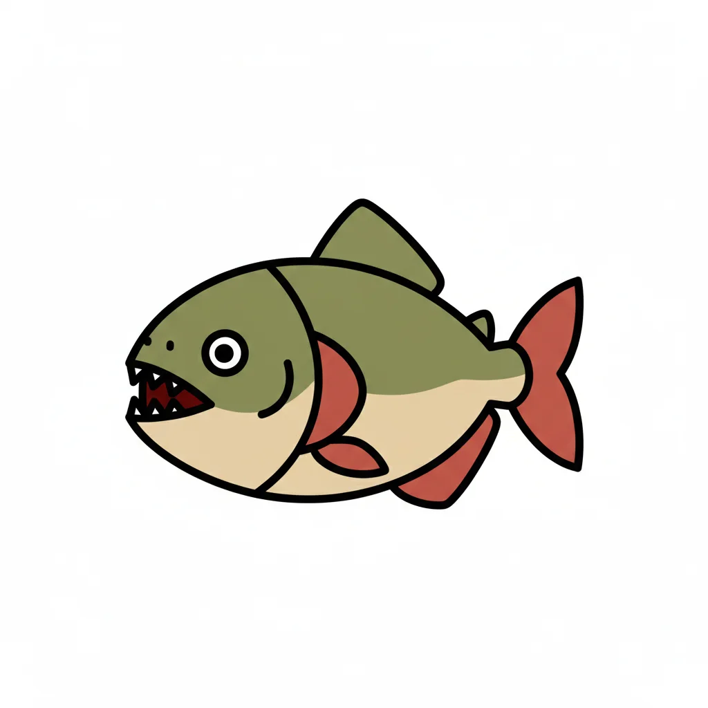 Ein cartoonartiger Fisch mit scharfen Zähnen und buntem Körper.