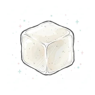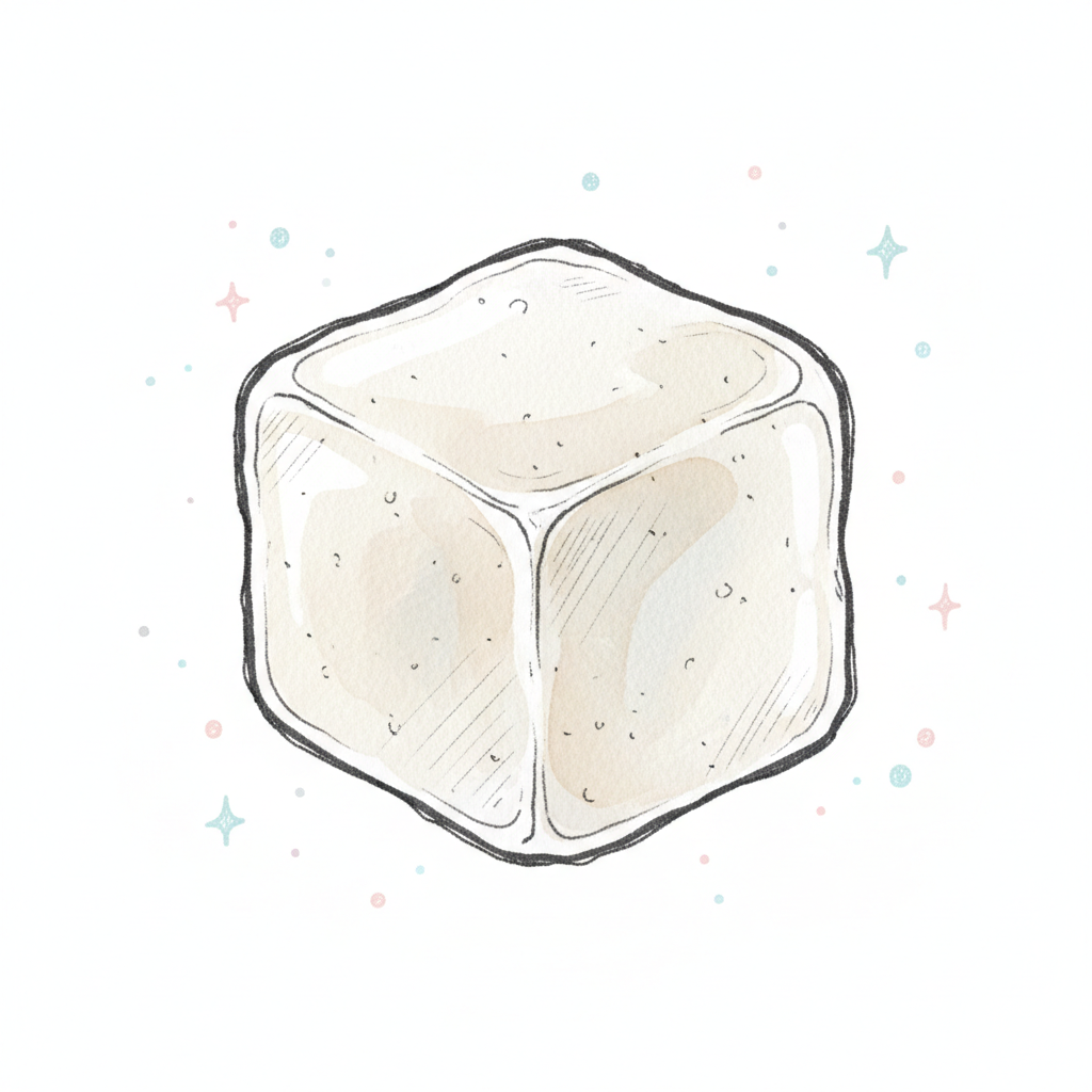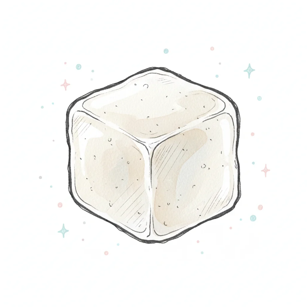 Eine gezeichnete, transparente Eiswürfelform auf einem hellen Hintergrund.