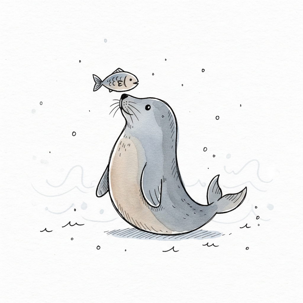 Niedliche Cartoon-Robbe balanciert einen Fisch auf ihrer Nase, Aquarell-Stil.