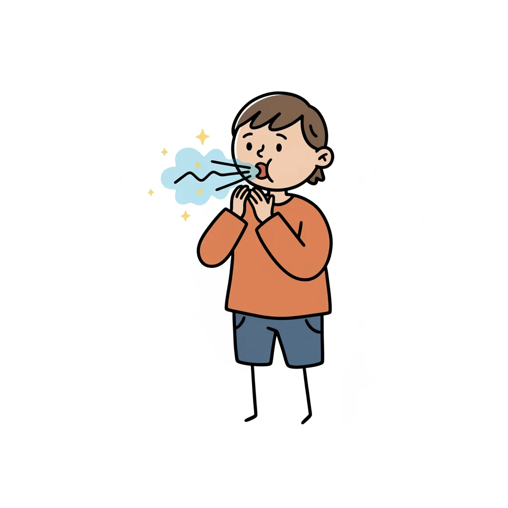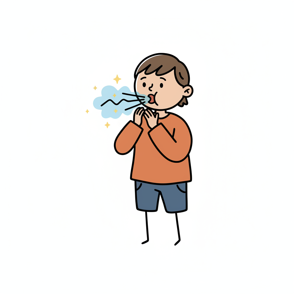 Cartoon-Junge bläst frischen Atem aus dem Mund, Hände am Kinn. Symbolisiert Frische oder Mundhygiene.