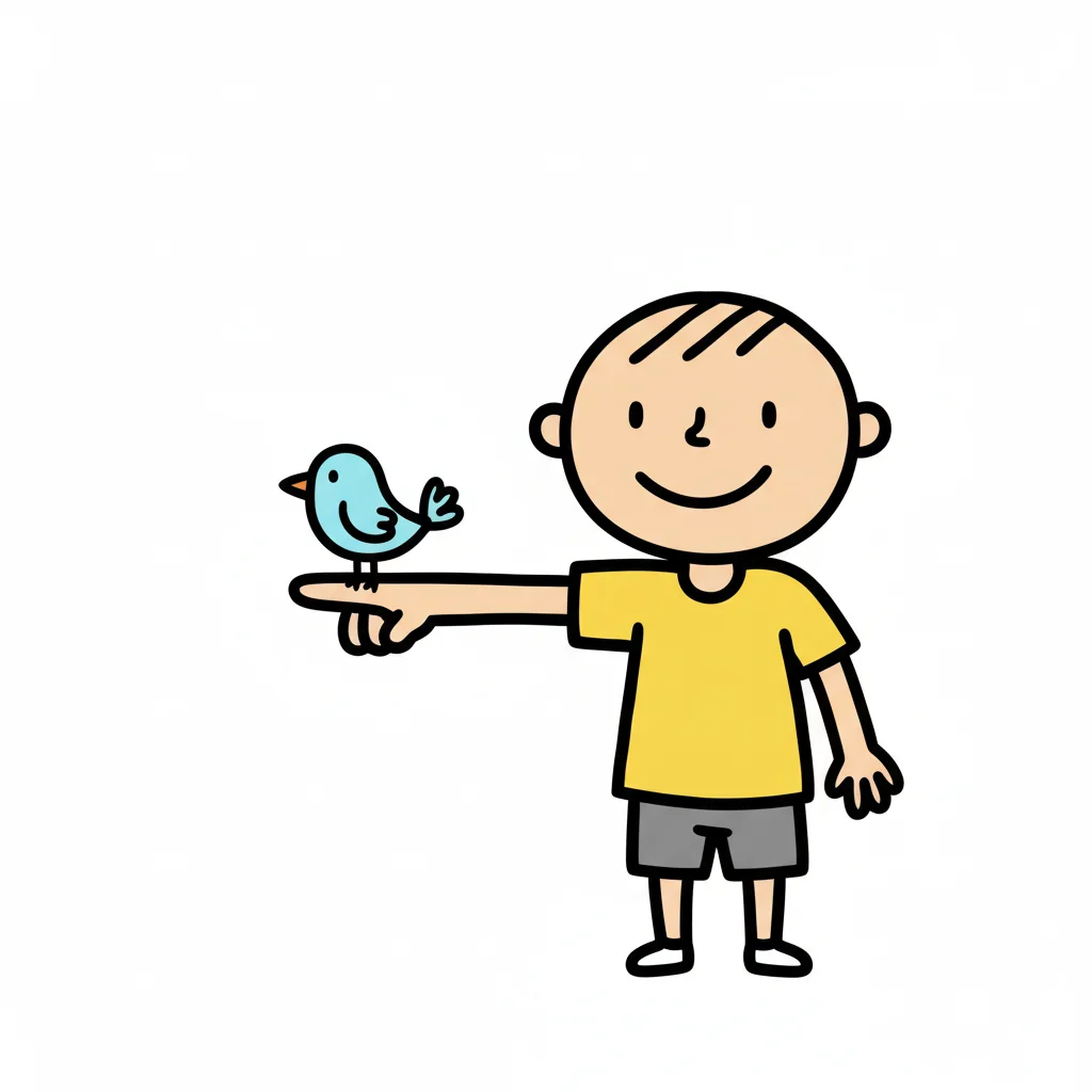 Ein lächelnder Cartoon-Junge mit einem kleinen blauen Vogel auf seinem Finger.