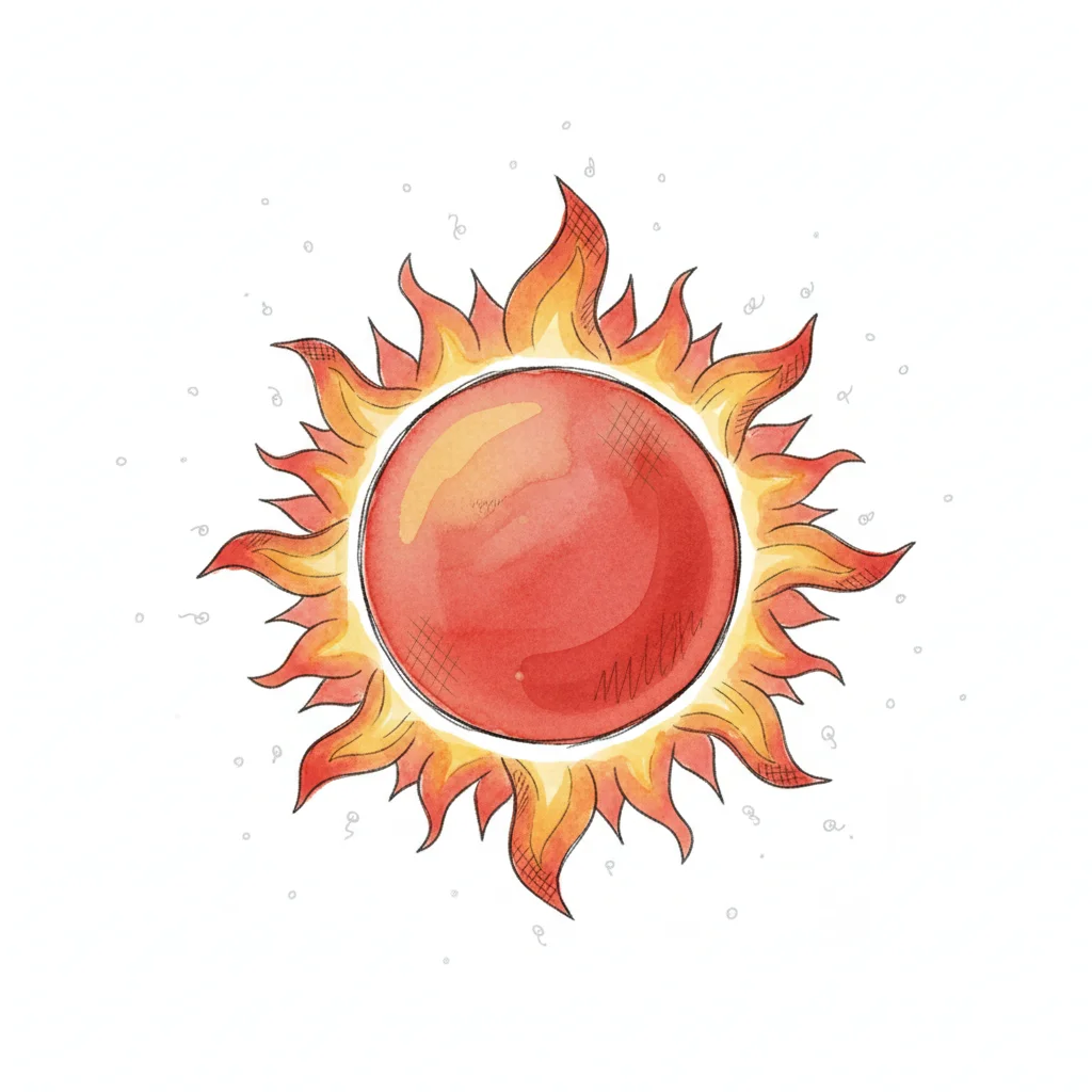 Stilisierte Sonne in Aquarell, rot-orange mit feurigen Strahlen auf weißem Hintergrund.