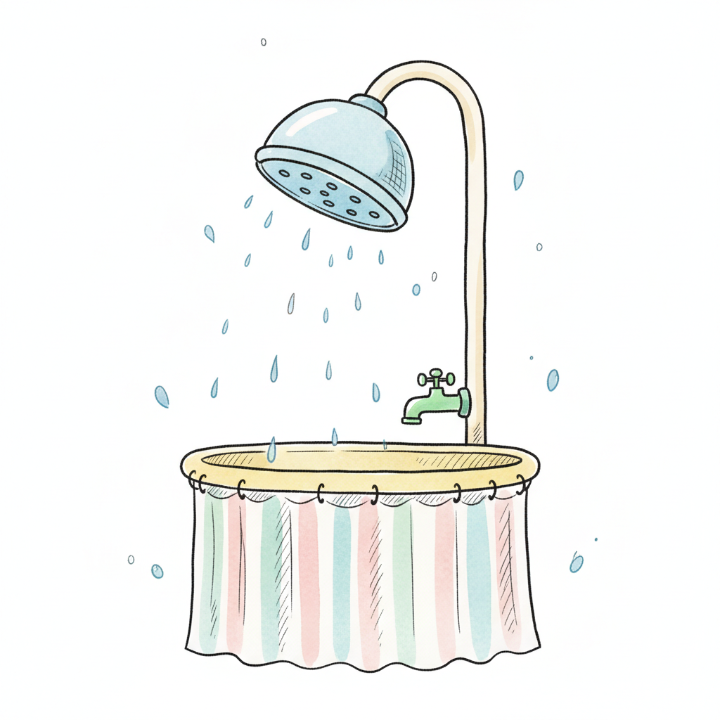 Cartoon-Illustration einer Dusche mit fallenden Wassertropfen über einer Badewanne mit Vorhang.