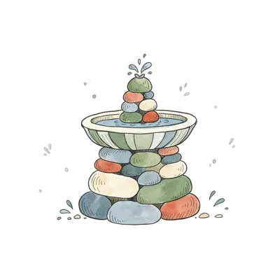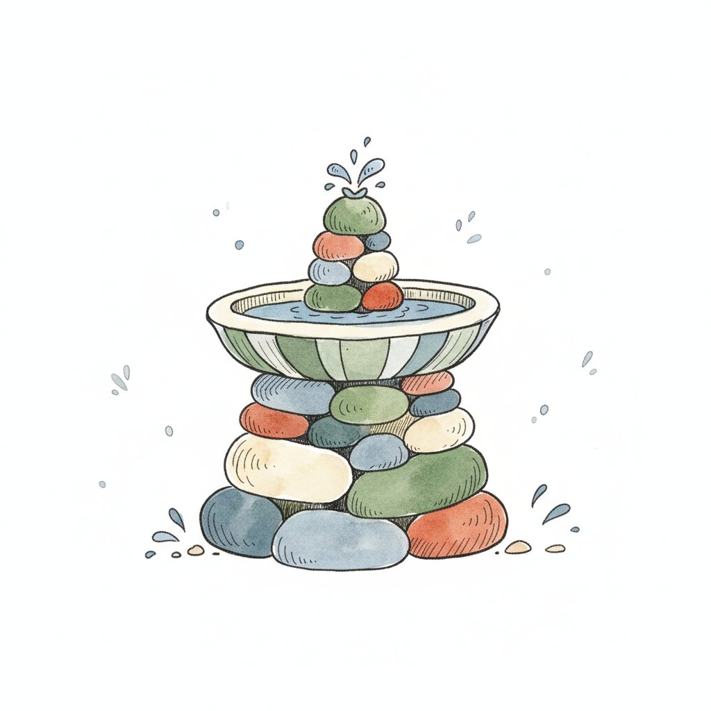 Bunte Steine bilden einen Wasserspeier mit plätscherndem Wasser in Aquarell.