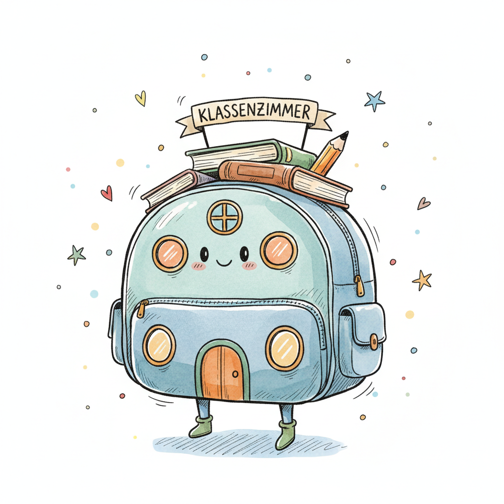 Niedlicher, anthropomorpher Rucksack als Haus mit Büchern, Bleistift und 'Klassenzimmer'-Banner.