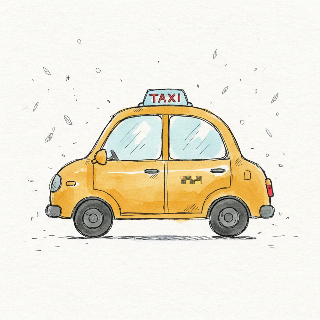 Eine niedliche, gelbe Taxizeichnung im Aquarellstil mit einem 'TAXI'-Schild auf dem Dach.