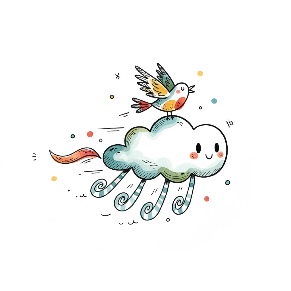 Niedliche Cartoon-Wolke mit Vogel reitet auf dem Wind, mit lächelndem Gesicht und Regenbeinen.