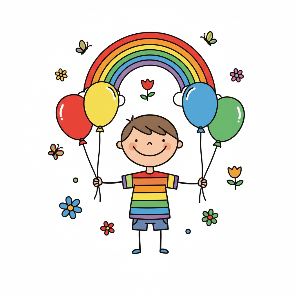 Fröhlicher Cartoon-Junge in Regenbogen-Shirt hält bunte Ballons unter einem Regenbogen.