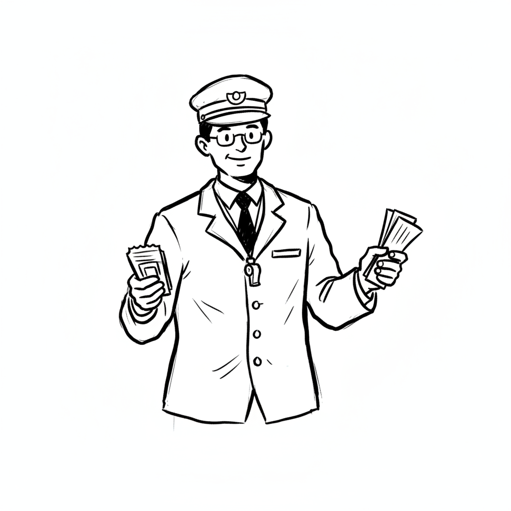Schwarz-weiße Illustration eines lächelnden Schaffners in Uniform, der Tickets in beiden Händen hält.
