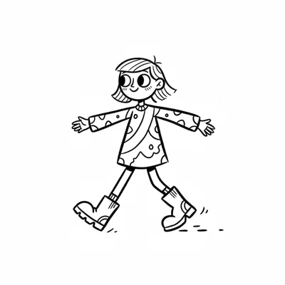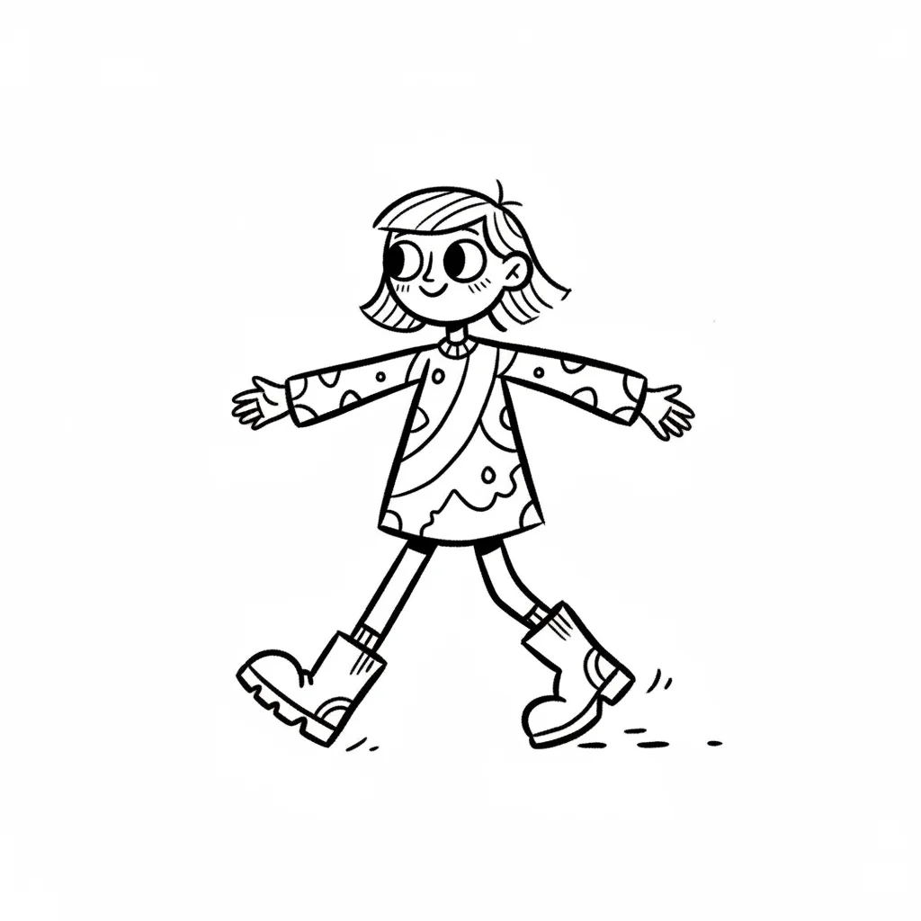 Schwarz-weiße Cartoon-Illustration eines fröhlich gehenden Mädchens in gemustertem Kleid und Stiefeln.