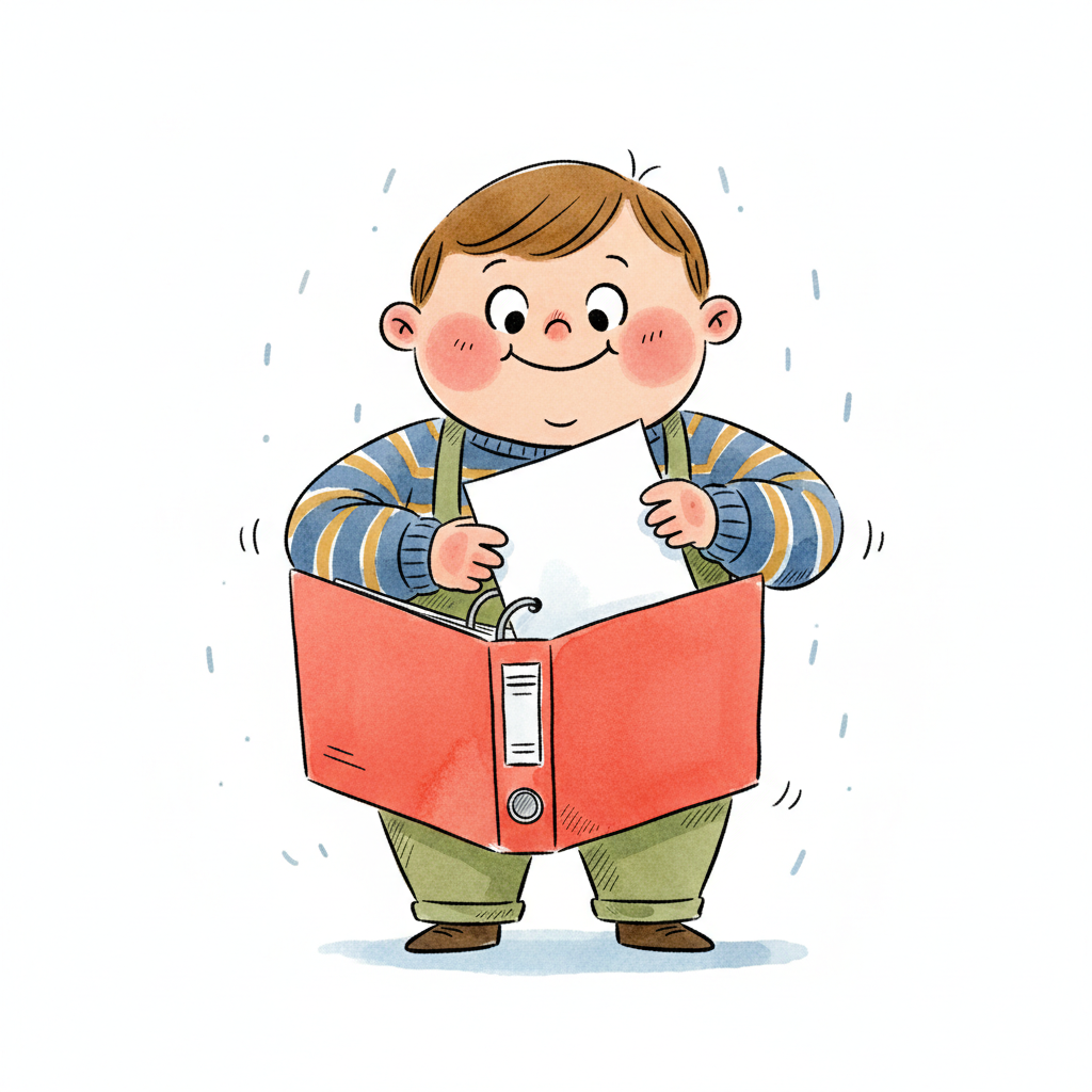 Ein Junge mit einem Ordner, der fröhlich ein Blatt Papier hält.