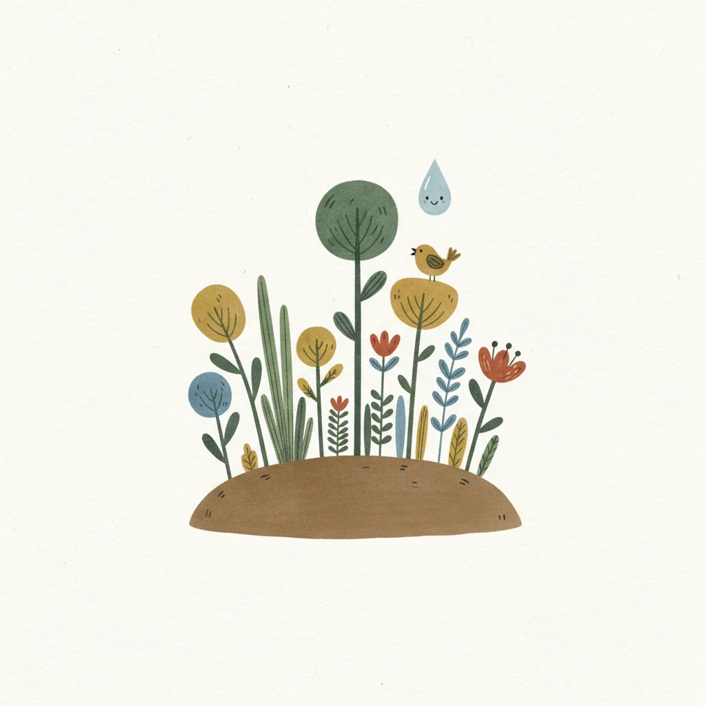 Niedliche Illustration eines Gartens mit Blumen, Vogel und lächelndem Regentropfen.