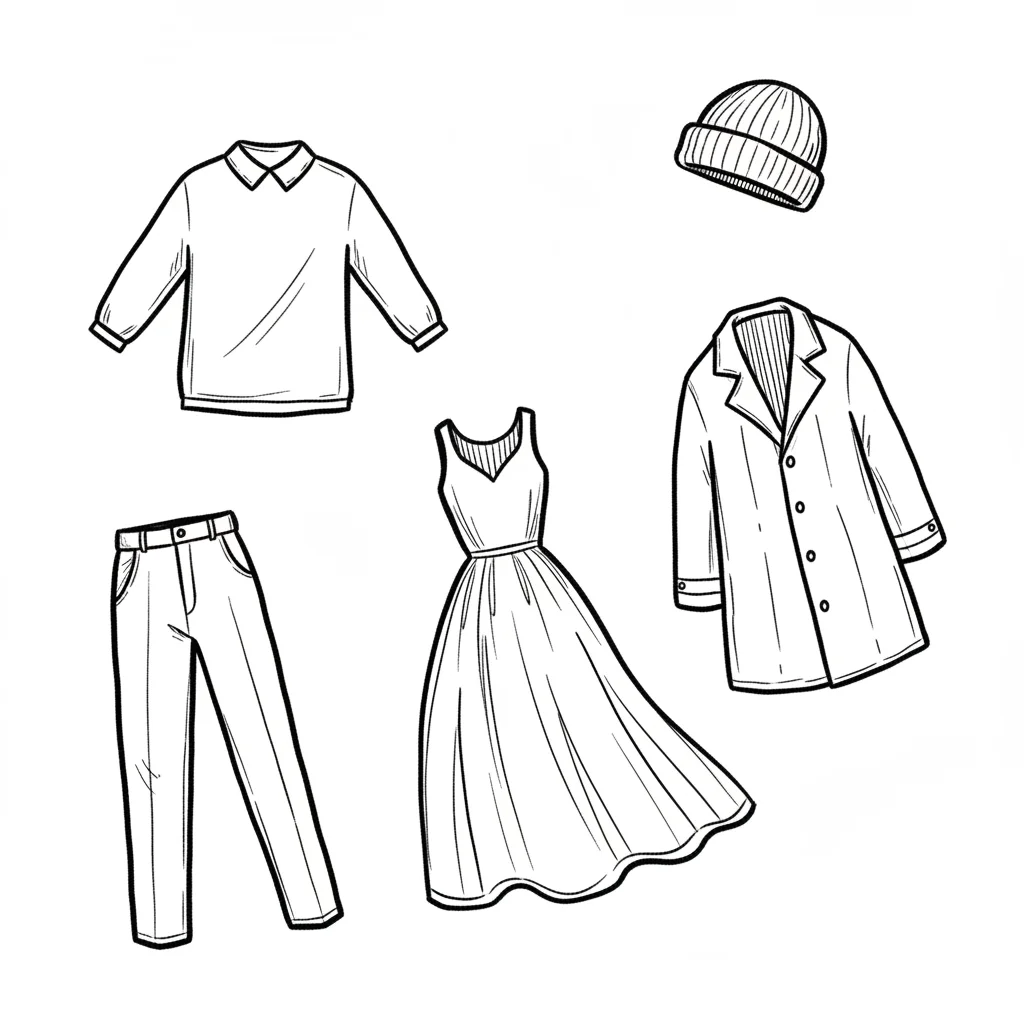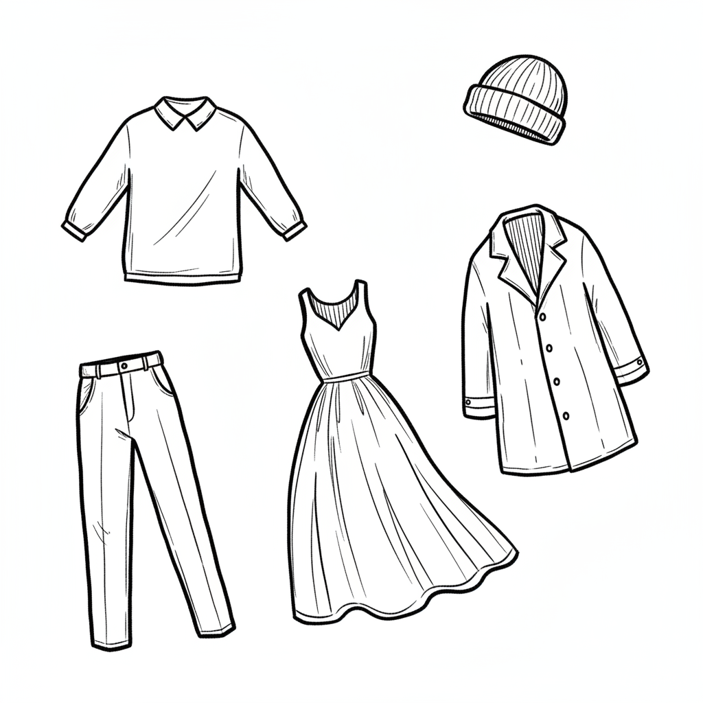 Schwarz-weiße Skizzen verschiedener Kleidungsstücke: Pullover, Hose, Kleid, Mantel und Mütze.