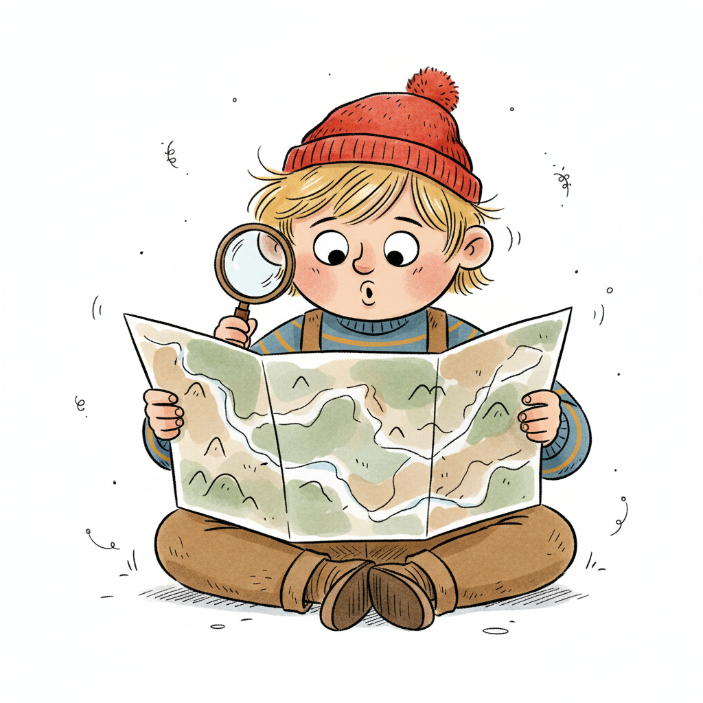 Cartoon-Kind mit roter Mütze und Lupe studiert überrascht eine Karte.