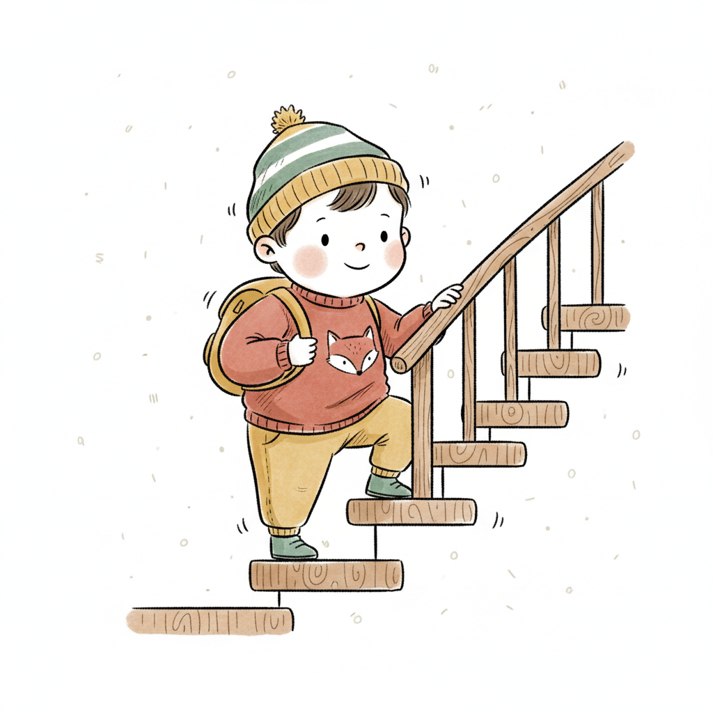 Ein Junge mit Mütze und Rucksack steigt eine Treppe hinauf.