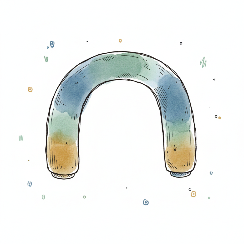Aquarell-Illustration eines U-förmigen Objekts in Blau-, Grün- und Brauntönen auf weißem Grund.