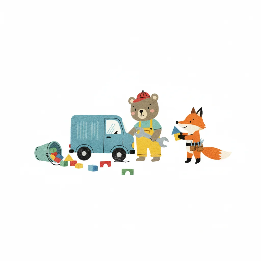Niedlicher Bär repariert Auto, Fuchs baut mit Klötzen. Spielszene mit Tieren und Spielzeug.