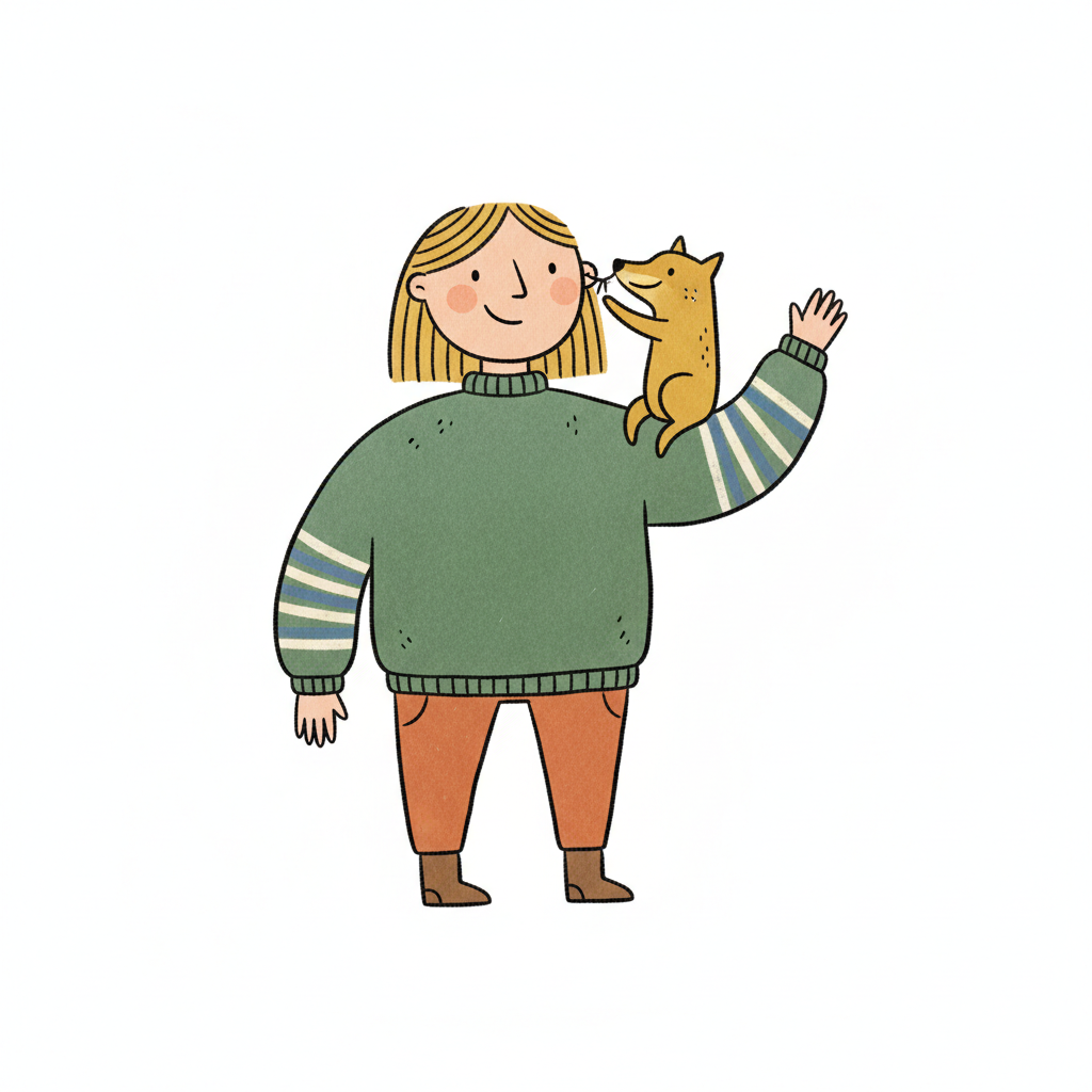 Fröhliche Cartoon-Person mit Hund auf der Schulter, der am Ohr schnüffelt.