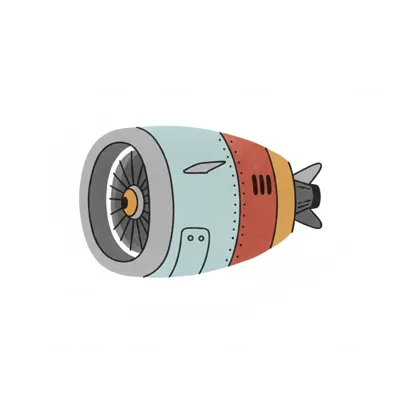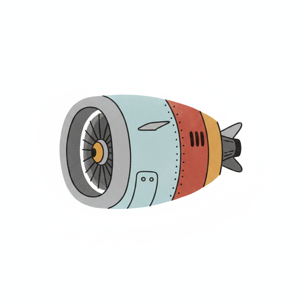 Illustration eines bunten Flugzeugtriebwerks im Cartoon-Stil mit Turbine und Heckflossen.