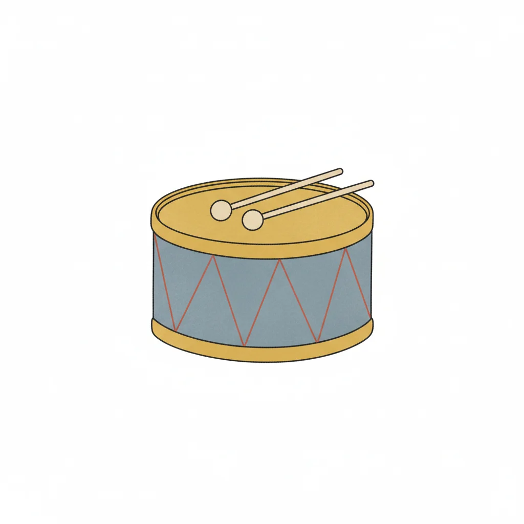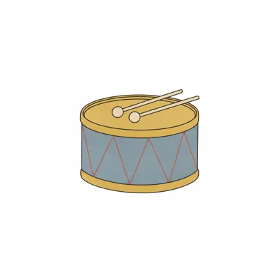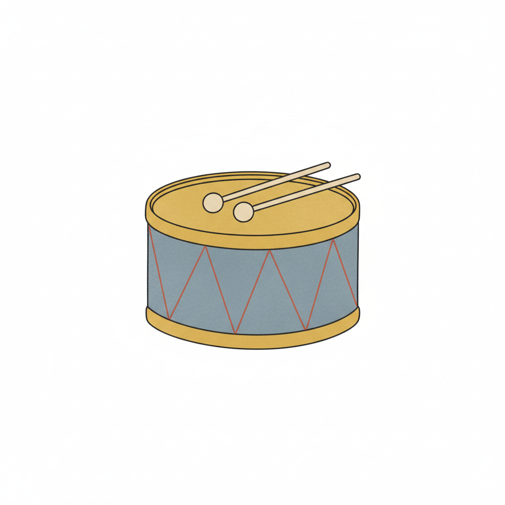 Eine einfache Illustration einer Trommel mit zwei Schlägeln darauf in Gelb, Blau und Rot.