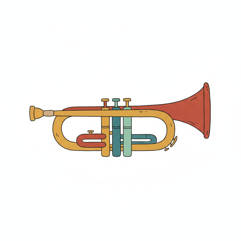 Eine farbige, handgezeichnete Trompete in Gelb, Rot und Blaugrün auf weißem Grund.