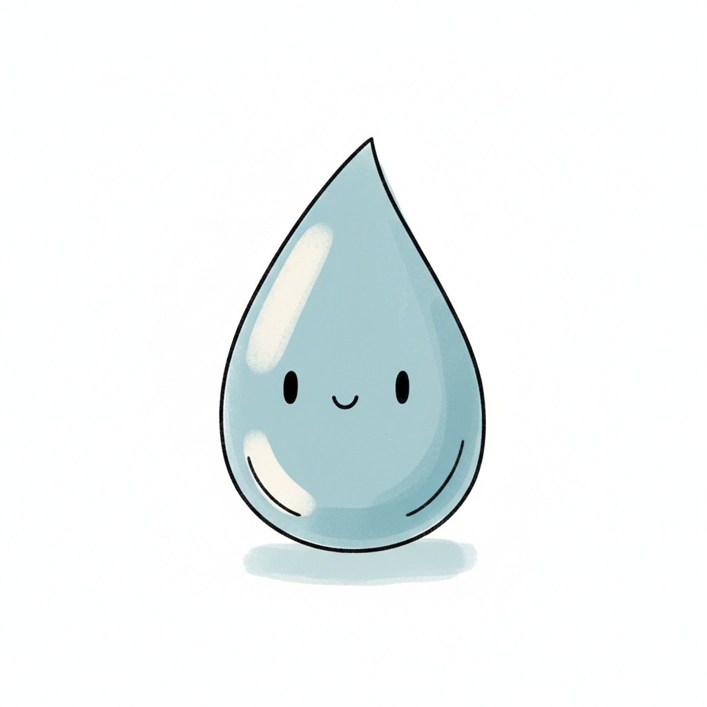 Niedlicher, lächelnder Wassertropfen in Cartoon-Stil auf weißem Hintergrund.