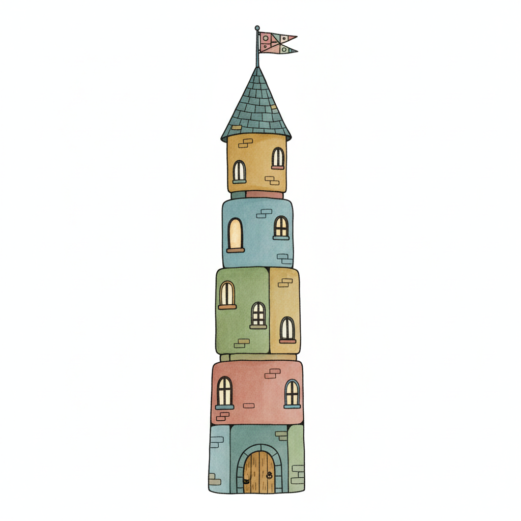 Illustration eines hohen, bunten Turms aus gestapelten Blöcken mit Fenstern und einer Fahne.
