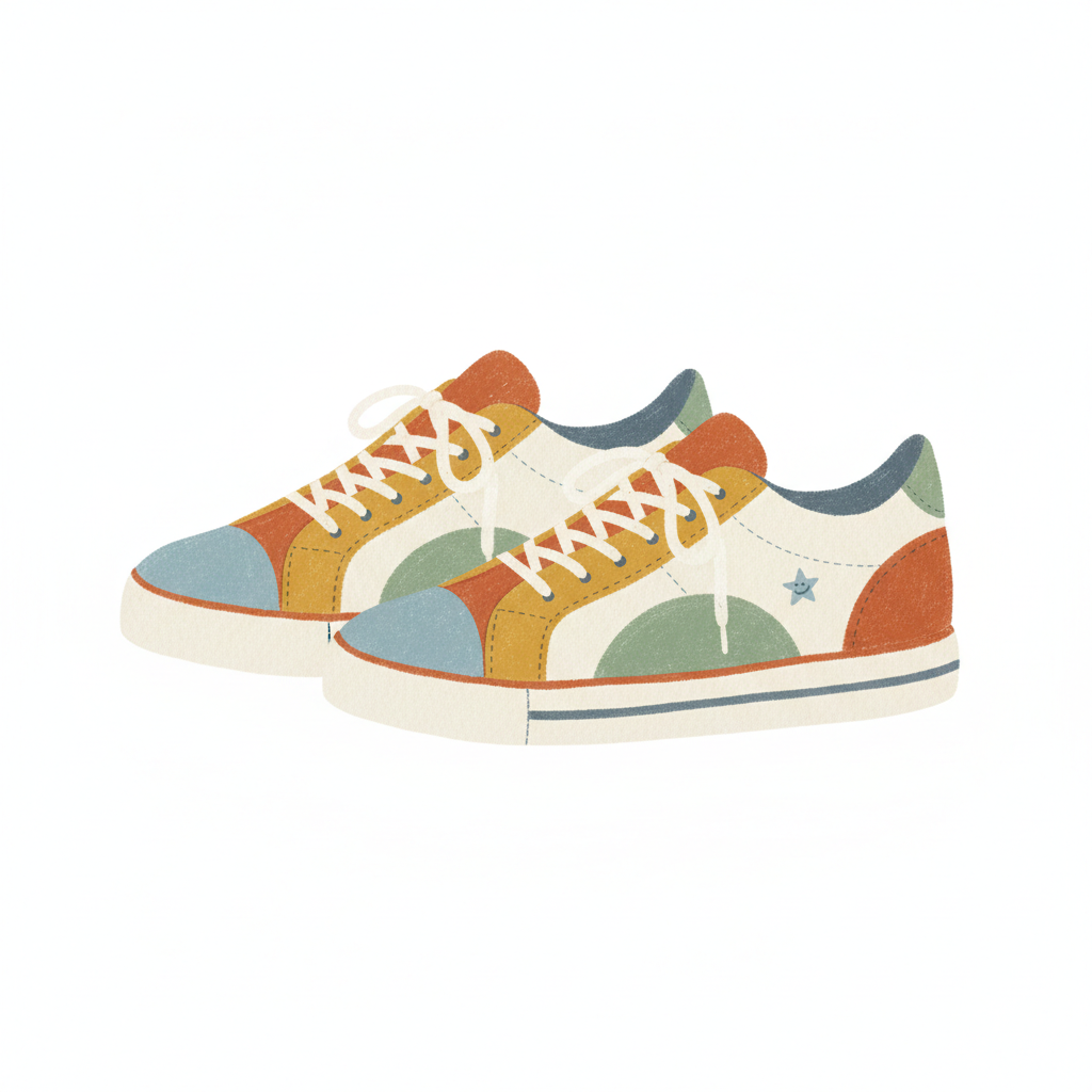 Ein Paar bunte Sneaker mit verschiedenen Farbfeldern und weißen Schnürsenkeln.