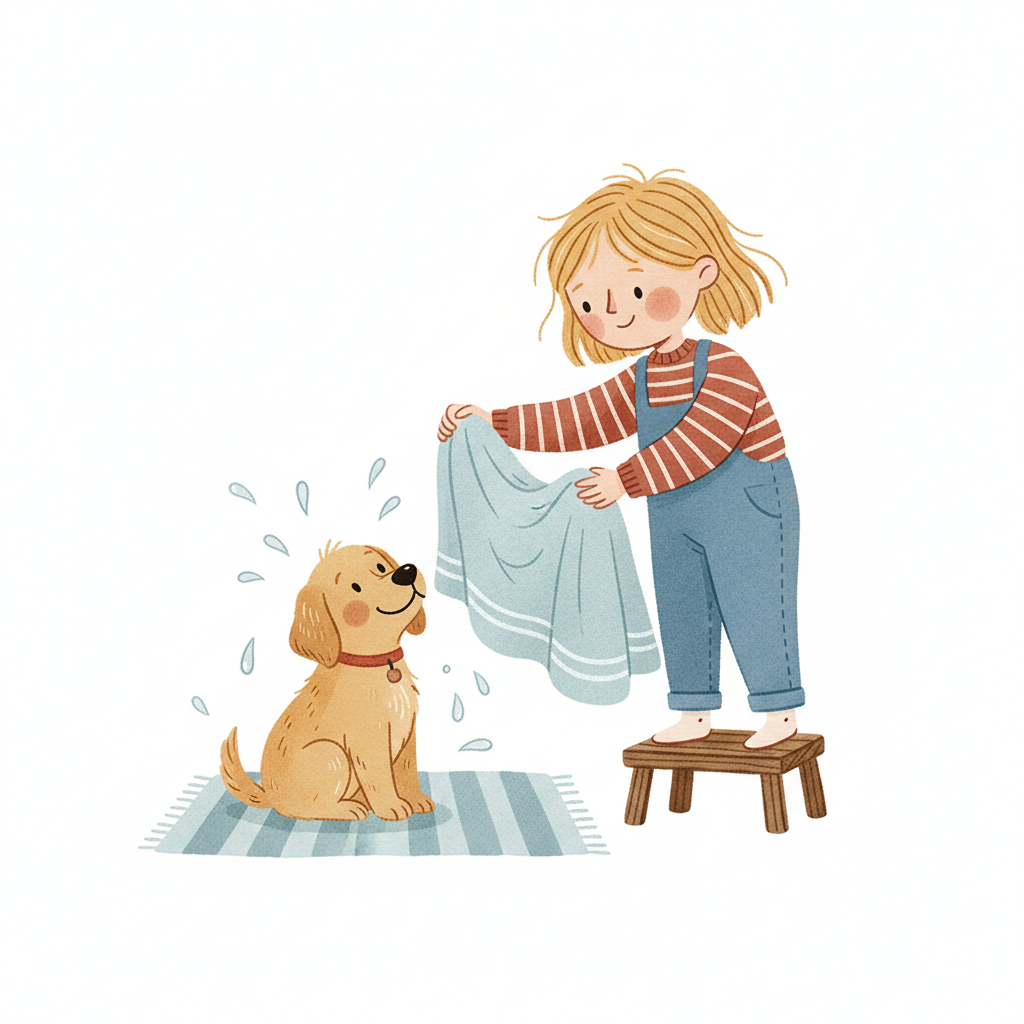 Fröhliches Mädchen trocknet seinen nassen Golden Retriever Welpen mit einem Handtuch.