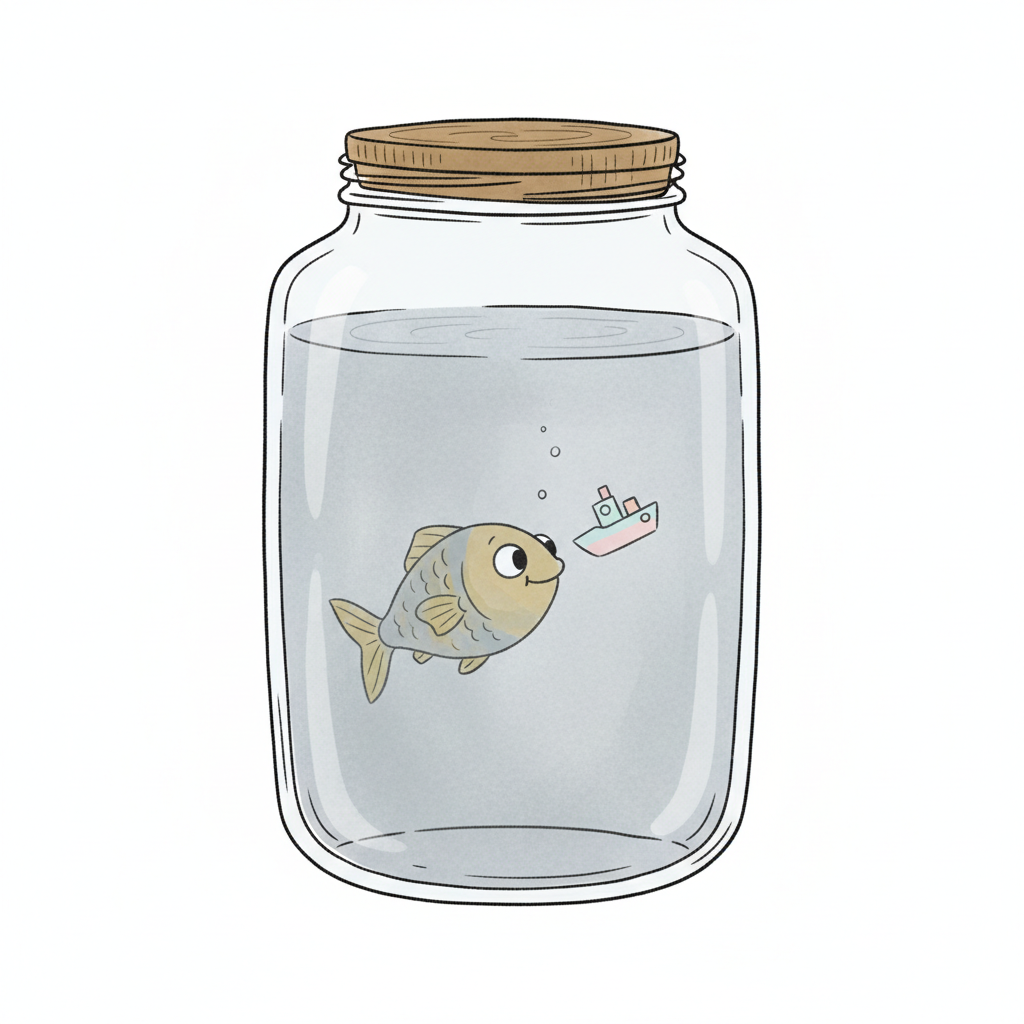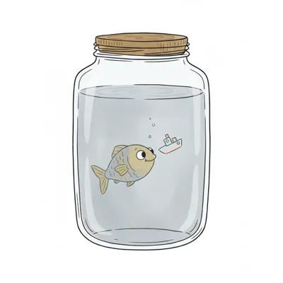 Ein Fisch in einem Glas schaut neugierig ein kleines Spielzeugboot an.