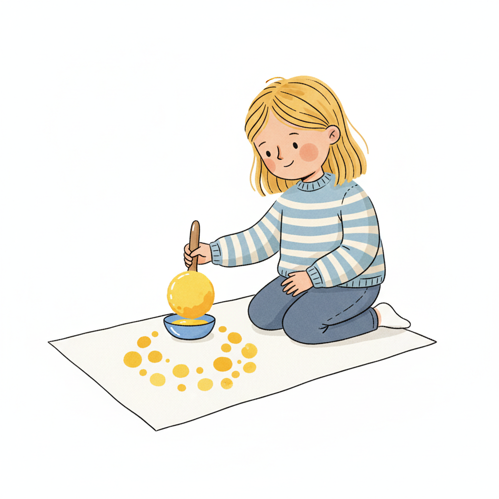 Mädchen kniet und malt mit gelben Punkten und einer Kugel auf Papier.
