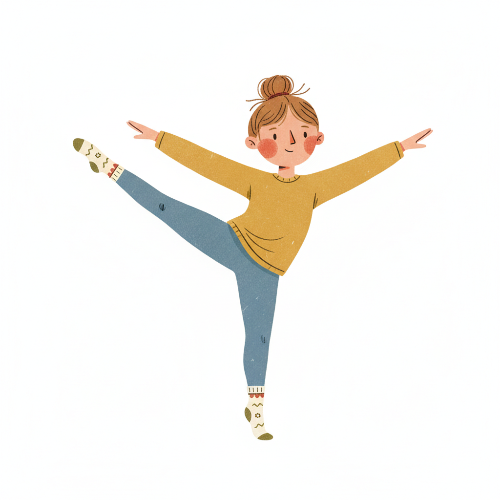 Fröhliches Cartoon-Mädchen balanciert auf einem Bein, Arme ausgestreckt, gelbes Oberteil.