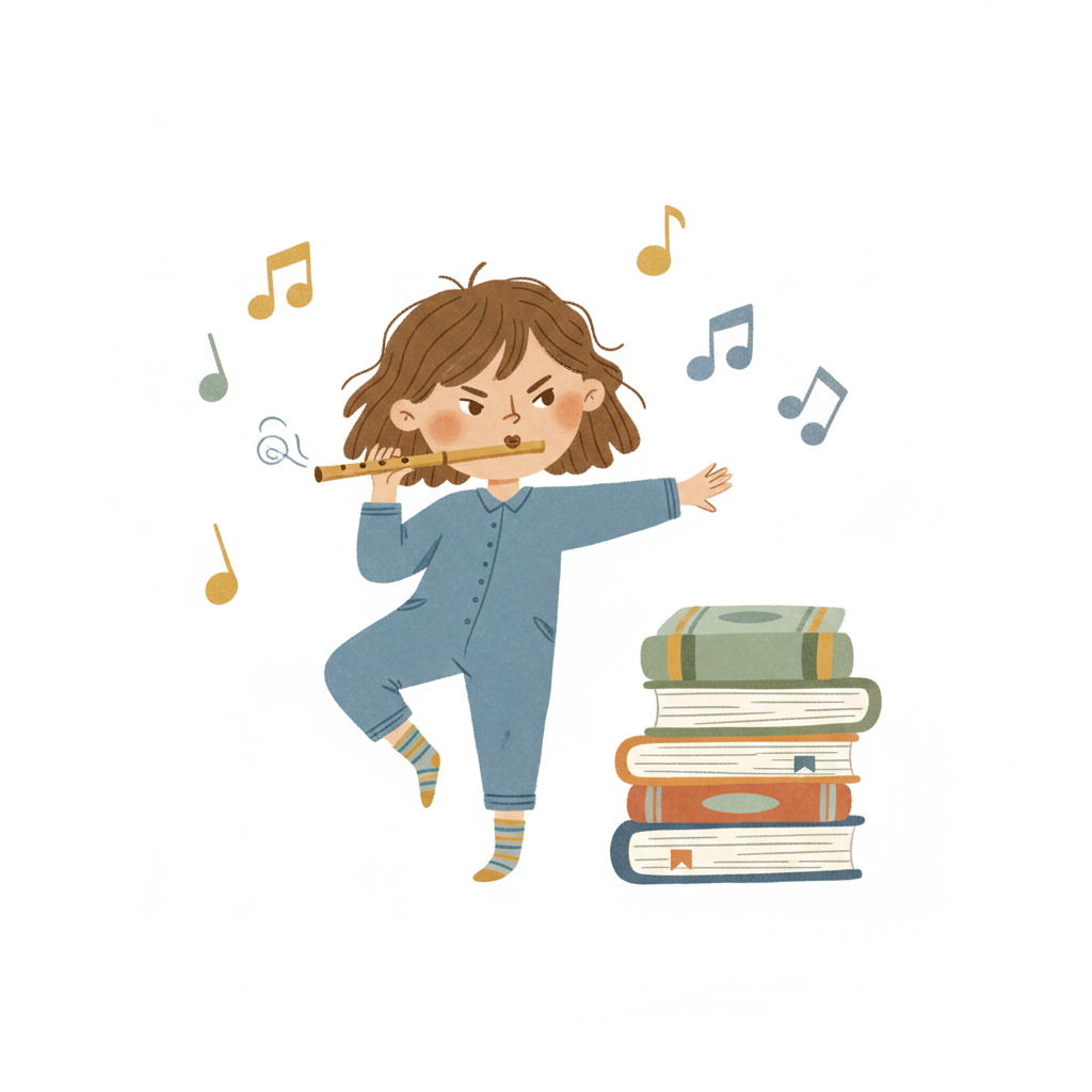 Wütendes Kind in Pyjama spielt energisch Flöte, umgeben von Noten und einem Bücherstapel.