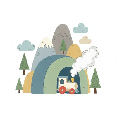 Niedliche Illustration eines Zuges, der aus einem bunten Tunnel in einer Berglandschaft fährt.