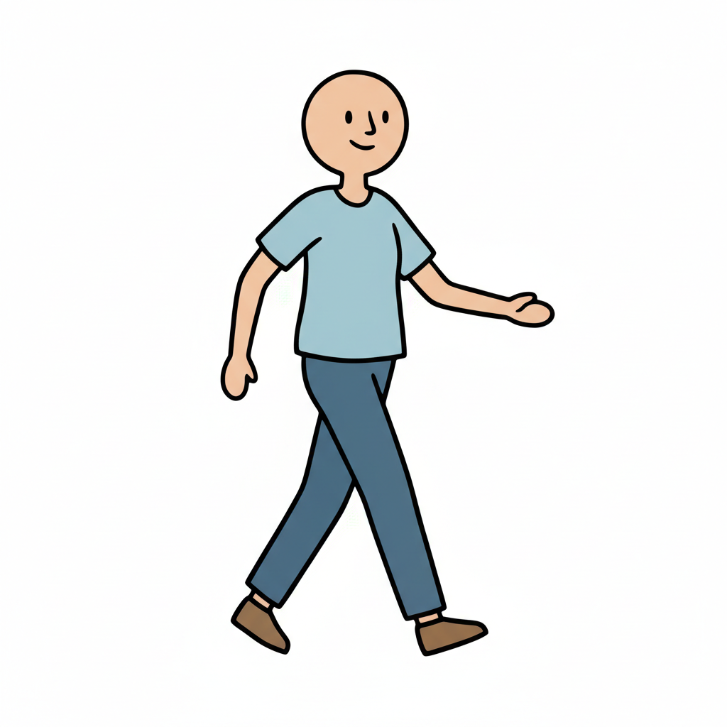 Minimalistische Illustration einer gehenden Person mit lächelndem Gesicht, blauem Shirt und Hose.