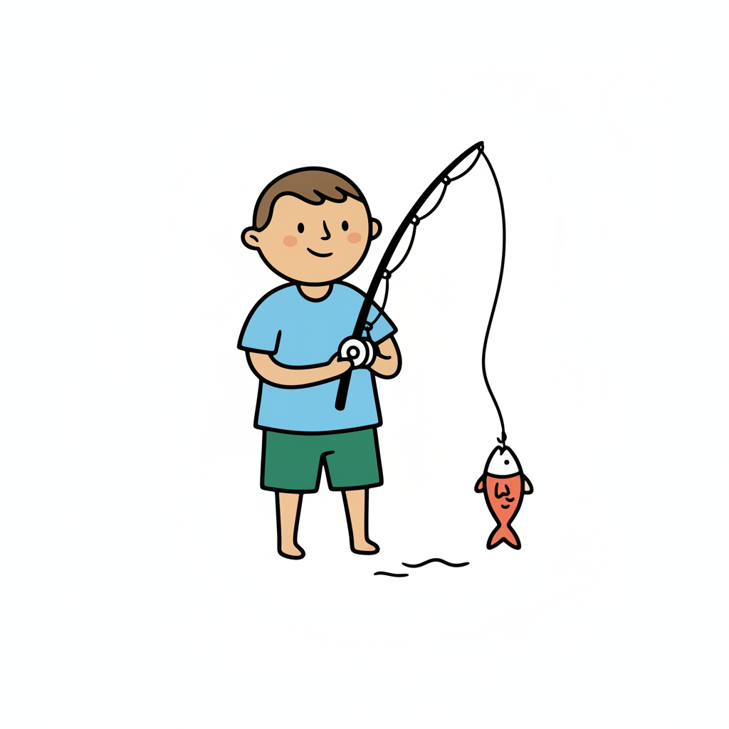 Fröhlicher Cartoon-Junge angelt und hält einen gefangenen Fisch an der Angel.
