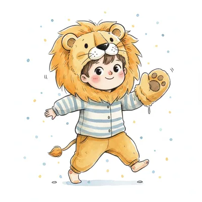 Fröhliches Kind in einem Löwenkostüm mit Mähne und Tatzenhandschuh, Aquarellstil.