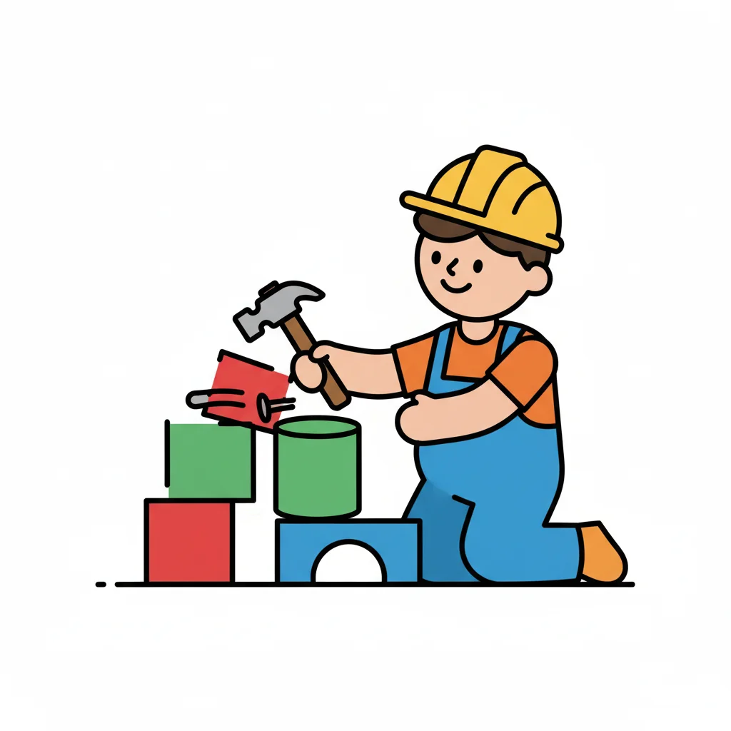 Ein lächelndes Cartoon-Kind sitzt und baut einen Turm aus bunten Bauklötzen.