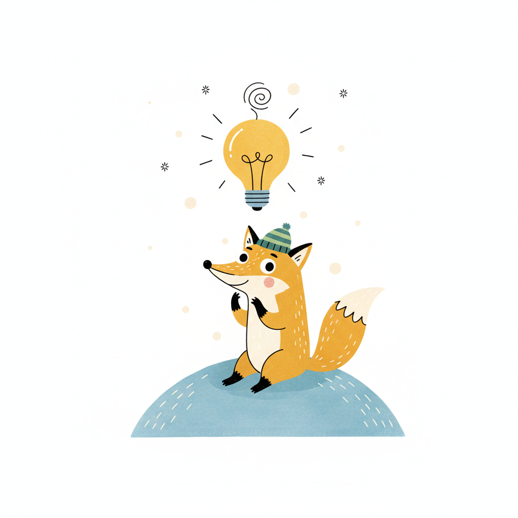 Ein süßer Fuchs mit Mütze sitzt auf einem Hügel, über ihm leuchtet eine Glühbirne als Idee.