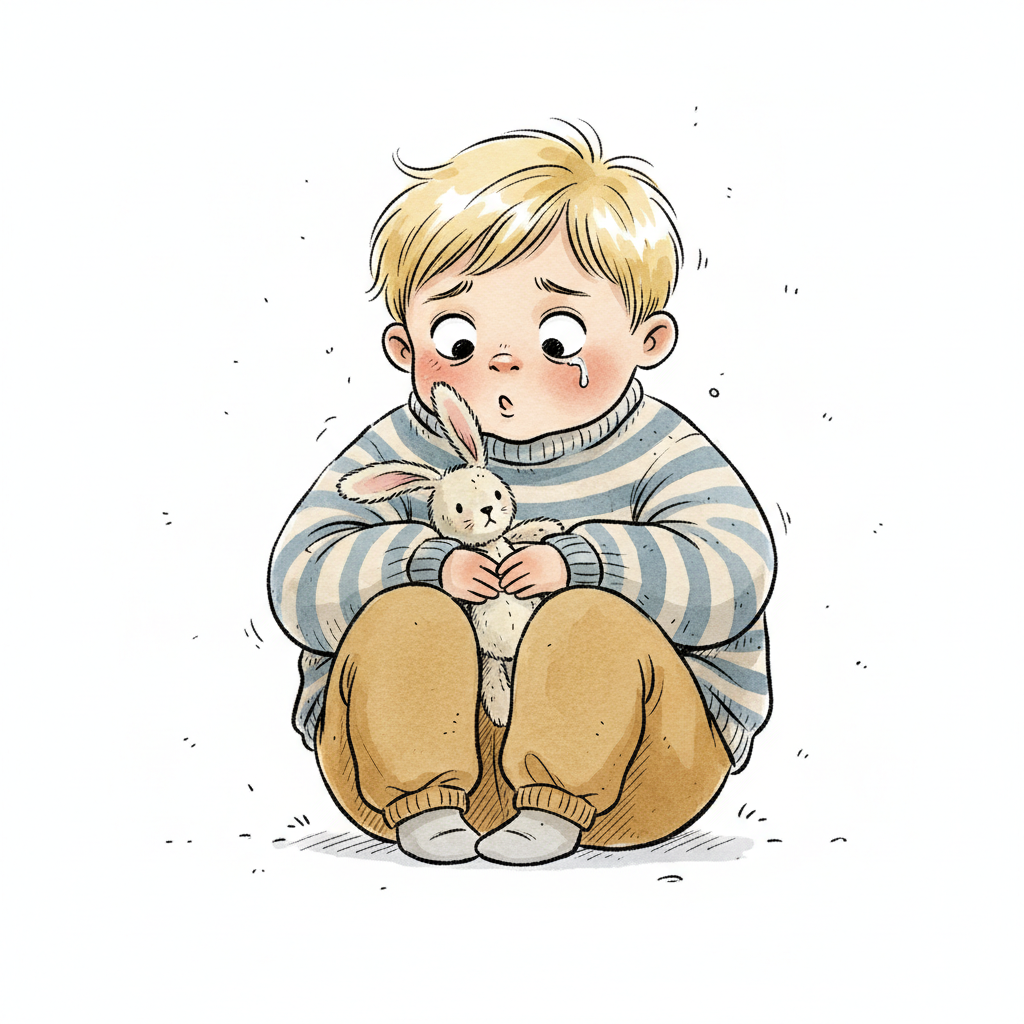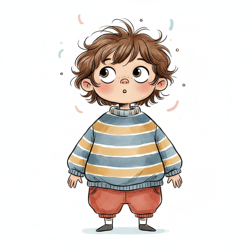 Niedliche, kindgerecht illustrierte Szene mit einem Kind oder einer Person als Hauptfigur, vor rein weißem Hintergrund, im frech-nordischen Aquarell-Skizzenstil. Klare, leicht wackelige Tuschekonturen, sichtbare Pinsel- und Strichtextur, dezente Schraffuren, weiche handgemalte Farbflächen in gedeckten Farben. Einfache, runde Formen. Keine harten Schatten, sondern sanfte, transparente Aquarellschichten. Leicht raue, handgezeichnete Linien statt glatter Vektorkanten. Subtile, vereinzelte Kritzelpunkte oder kleine Details im Hintergrund (wie Pünktchen oder feine Striche), aber keine echte Umgebung oder Landschaft. Die Figur ist mittig zentriert. Insgesamt charmant, humorvoll, warm und handgemacht wirkend. WICHTIG: Das Bild darf ABSOLUT KEINEN TEXT, KEINE BUCHSTABEN und KEINE ZAHLEN enthalten.