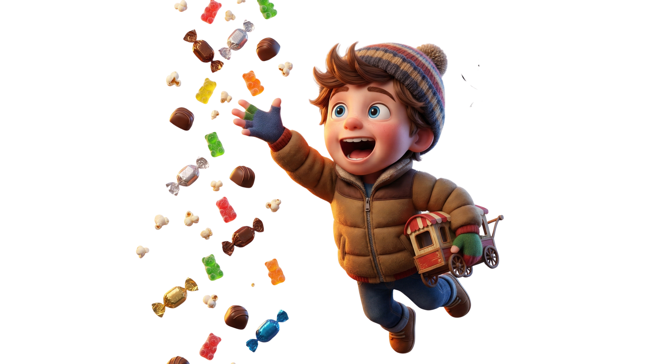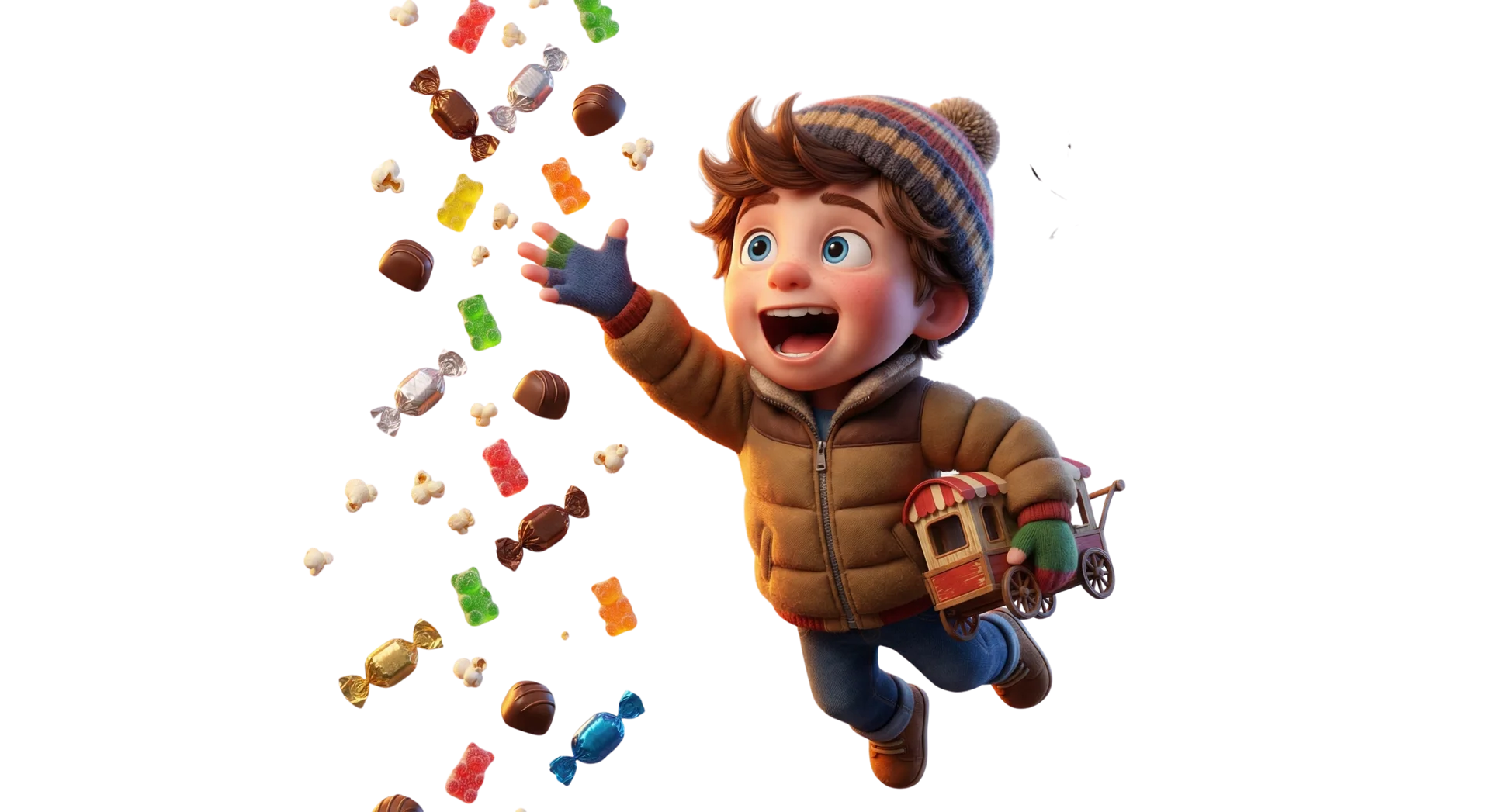 Ein fröhlicher Junge springt mit Süßigkeiten in der Luft.