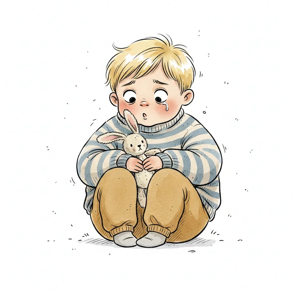 Ein Junge sitzt auf dem Boden und hält ein Stoffkaninchen umklammert.