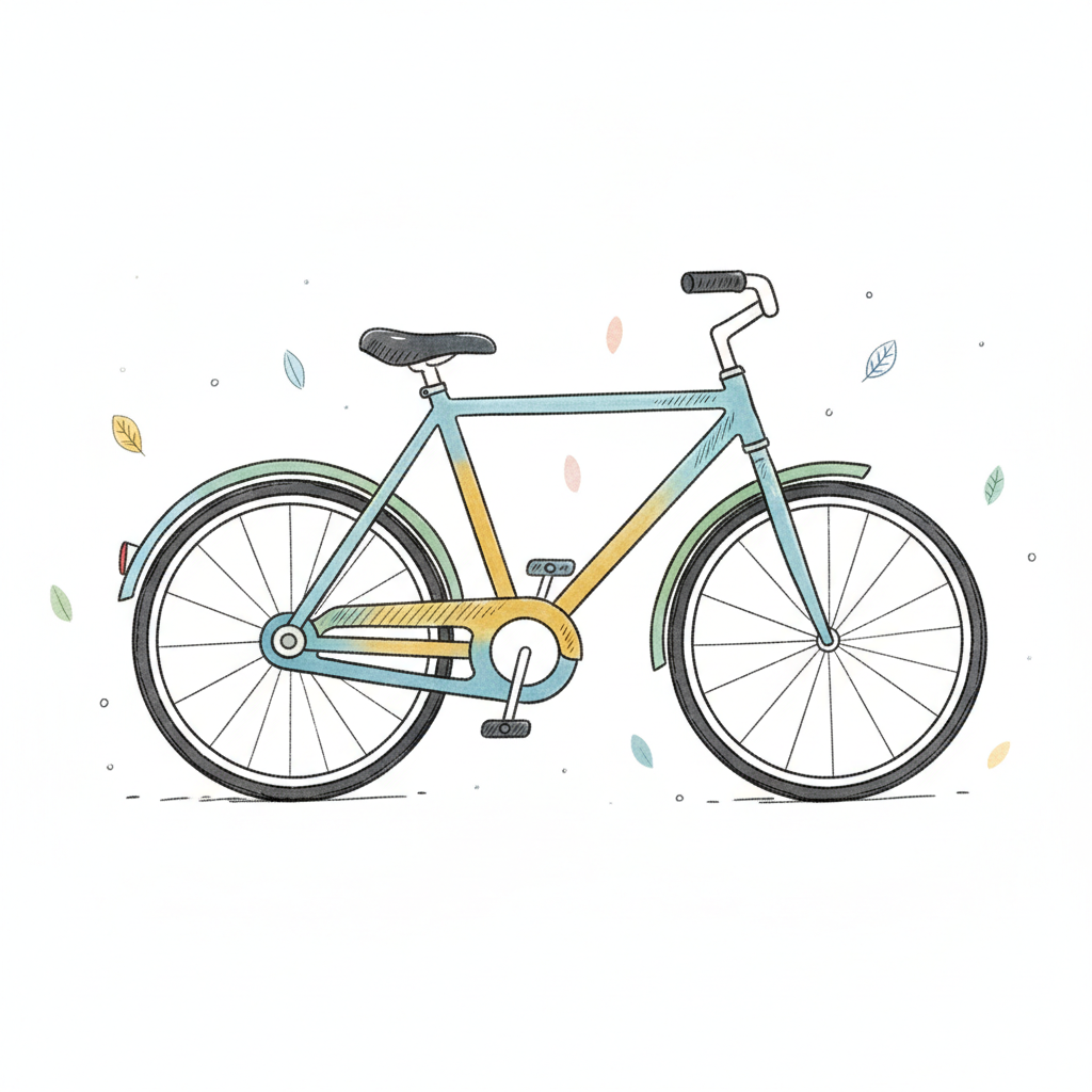 Ein stilisiertes Fahrrad mit bunten Akzenten und fröhlichen Blättern im Hintergrund.