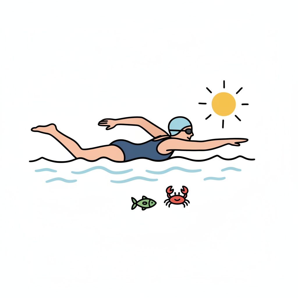 Illustration einer Schwimmerin im Meer unter der Sonne, begleitet von Fisch und Krabbe.