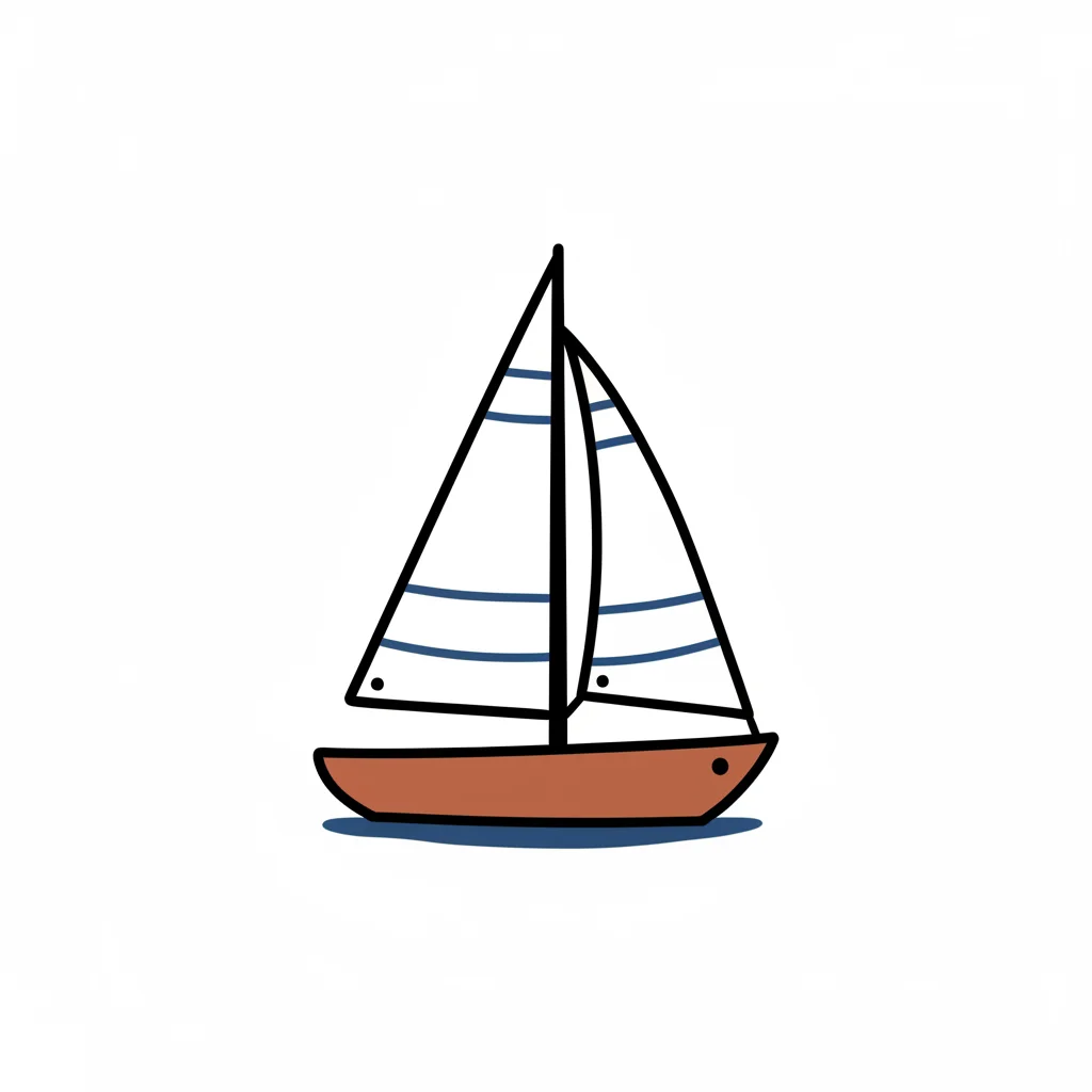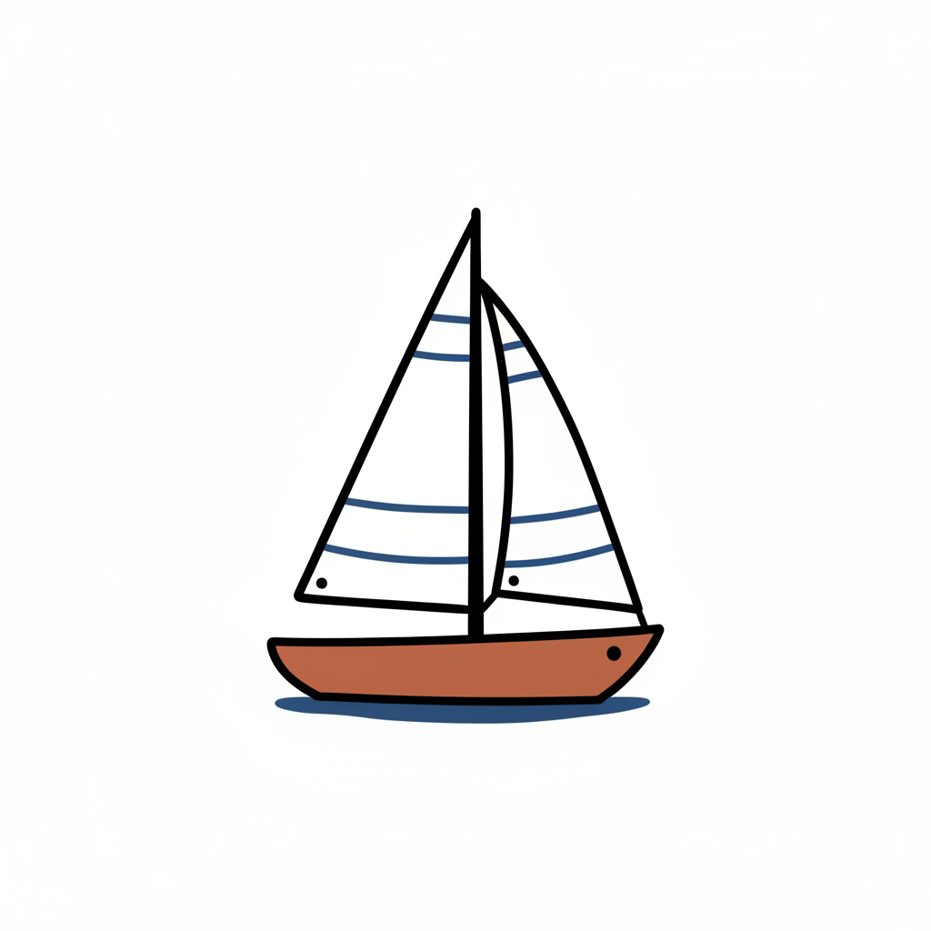 Einfache, stilisierte Zeichnung eines Segelboots mit weißen Segeln und braunem Rumpf auf weißem Grund.