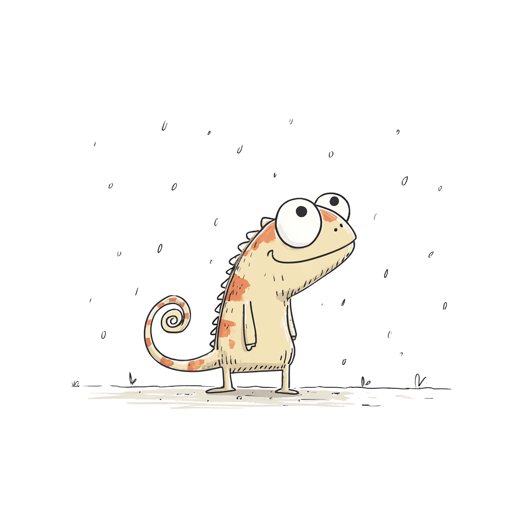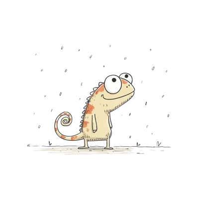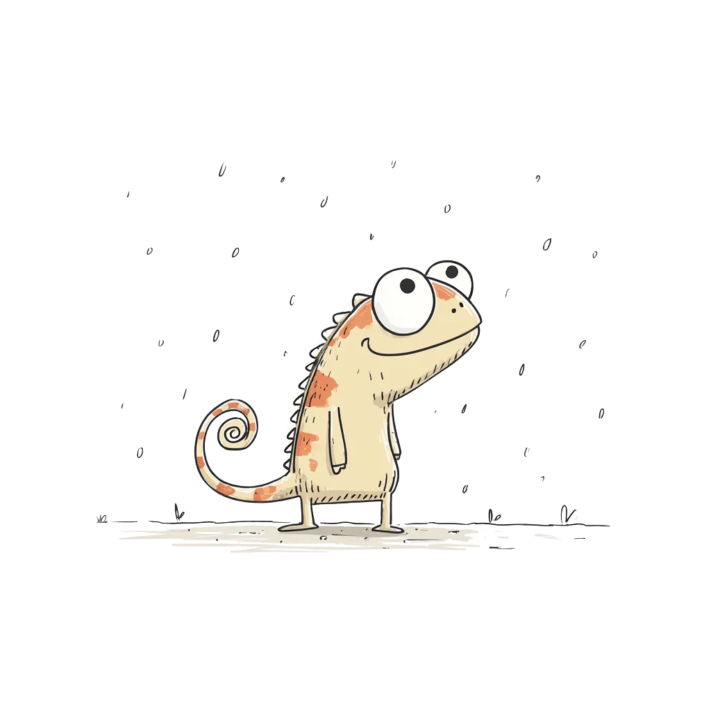Ein cartoonhaftes Chamäleon mit großen Augen und fröhlichem Ausdruck.