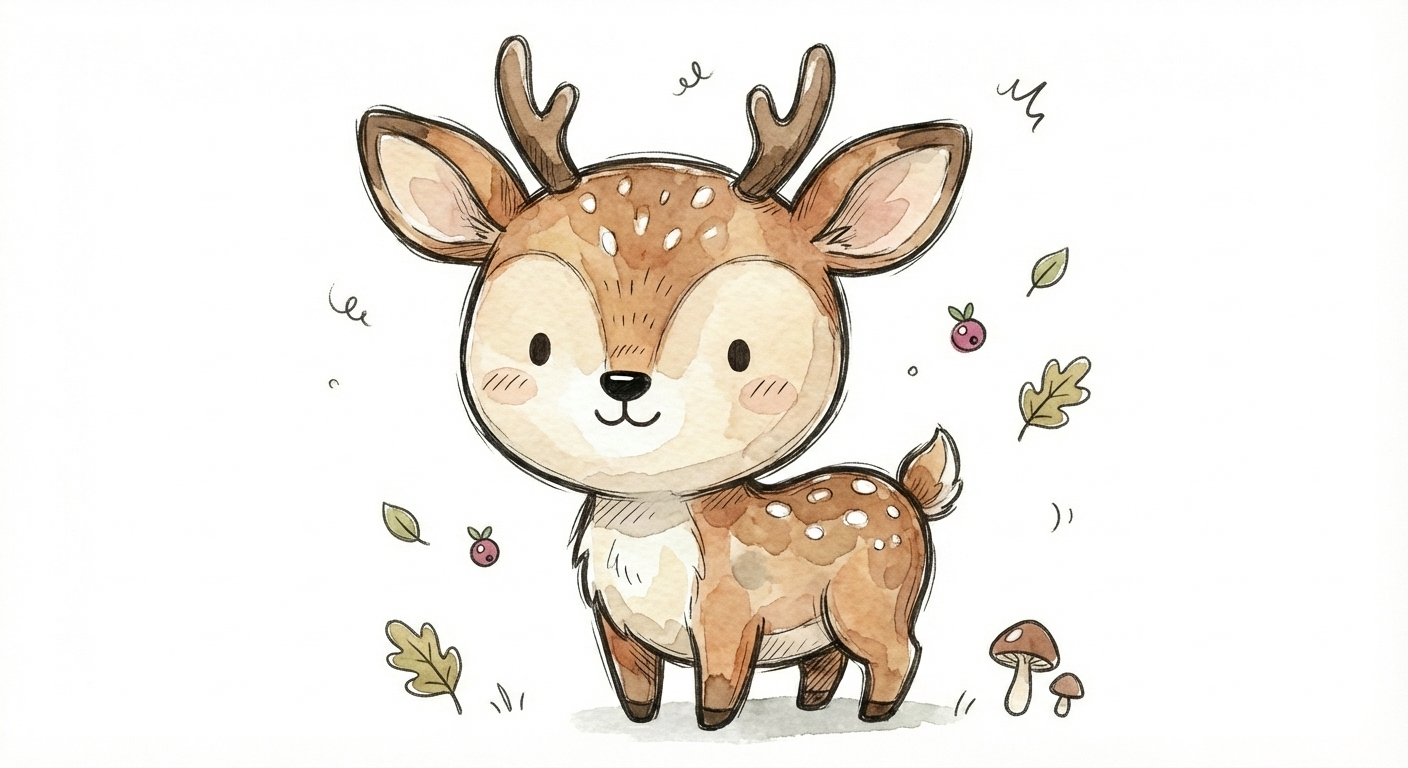 Ein niedliches, cartoonhaftes Reh mit kleinen Geweihen in einem Wald.